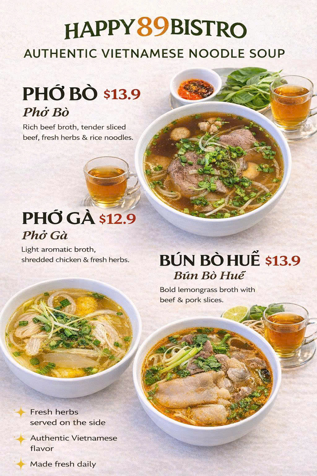 Happy89Bistro is a cozy dining spot where we serve thoughtfully crafted dishes full of flavor and inspiration. From familiar favorites to creative twists, we aim to make every meal a warm and memorable experience.